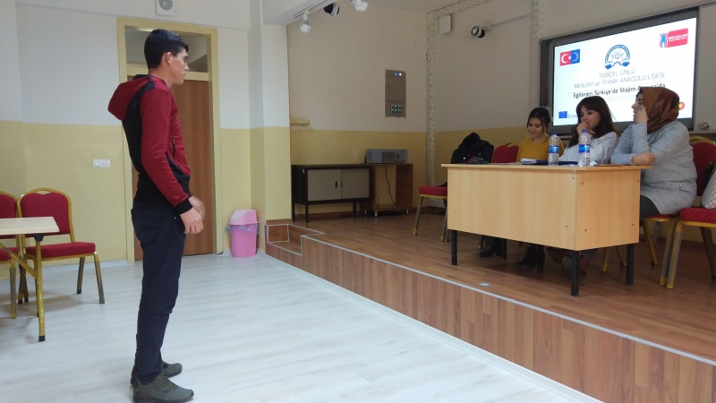 Eğitimim Türkiye´de Stajım Avrupa´da Projesi ile yurtdışında staj yapmak isteyen öğrencilerimiz İngilizce konuşma bilgileri okulumuz İngilizce öğretmenleri Tuba DOĞANAY, Yasemin TOZLU ve Ayşe PALA´nın bulunduğu komisyon tarafından değerlendirildi. Değerlendirme notları öğrencilerin proje puanı oluşturulurken kullanılacaktır.